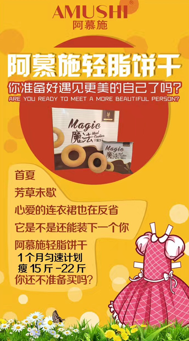 和市面上的传统减肥药、减肥茶相比,阿慕施轻脂饼干不刺激肠胃、无腹泻、无腹痛,既营养健康,又在消脂的过程中不减水分只减脂肪,可谓是“放开吃也能拥有好身材”。这款阿慕施减肥饼干,主要由号称“素食之王”“超级谷物”“营养黄金”的藜麦组成,因口感独特、拥有一种淡淡的清香而被营养界看重,具有均衡补充营养,增强机体功能,修复体制,增强免疫及减肥等功效,当然长期食用,效果肯定更显著。正因为产品安全、营养、健康、天然,所以大家在这个夏天,无需在健身房挥汗如雨,也无需各种节食减肥的痛苦,阿慕施轻脂饼干让你华丽成为别人眼中的焦点,心动就快行动吧!阿慕施帝V军团强烈推荐哦。
