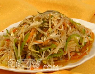 【主持人】另外刚才我说的这个十丝,它里面有青色有辣椒丝,红的,黄的,有很多很多包括笋丝,像玉一样,这个颜色应该说对人的食欲,对人体健康也是有益